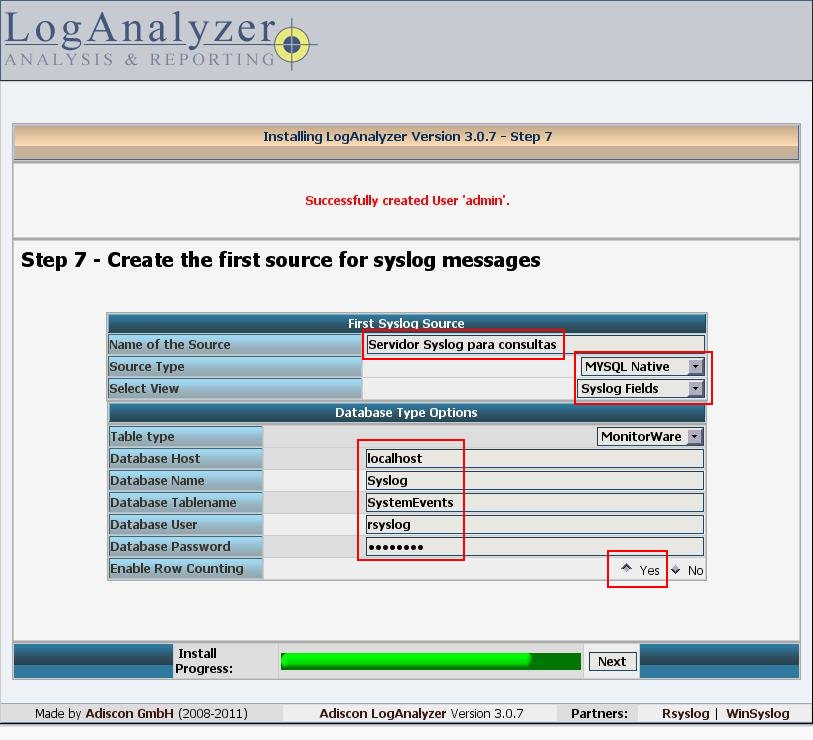No passo 6, escolha um usuário e senha que terá acesso administrativo ao LogAnalyzer.