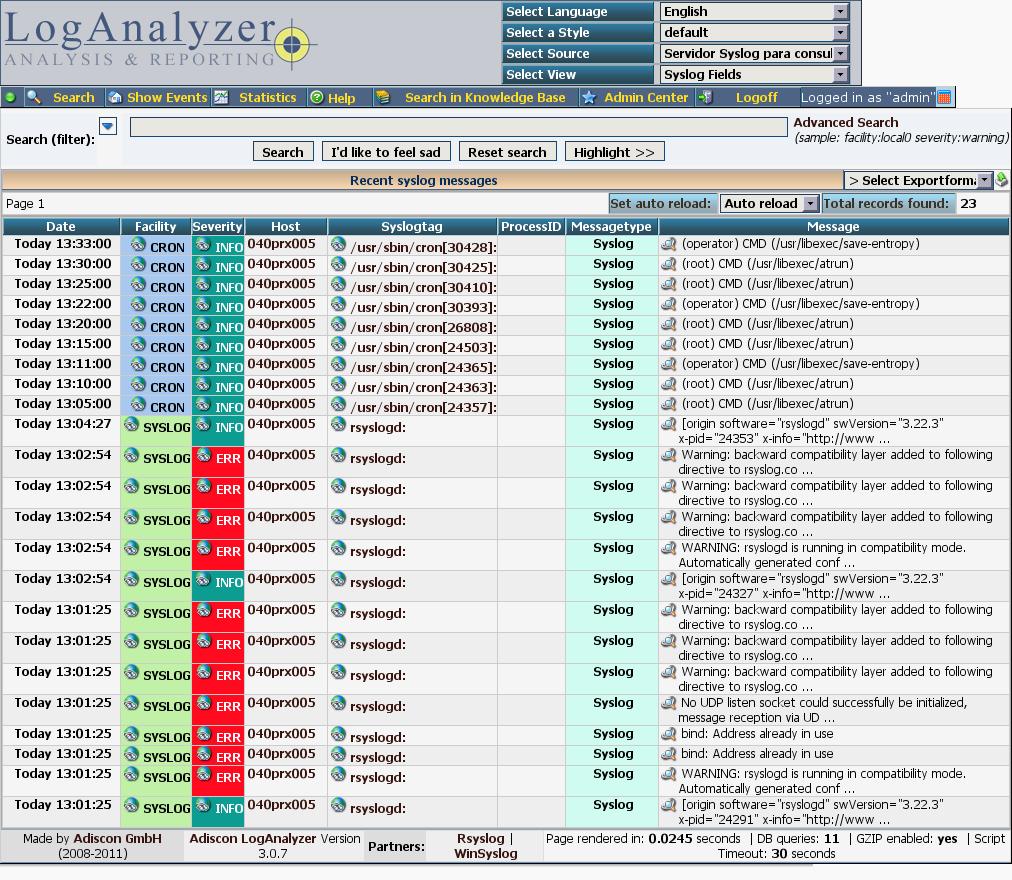 Consegui instalar normalmente seguindo seu poderoso tutorial porém estou usando CENTOS 6.3 com MySQL 5.1 sendo o restante igual sua configuração, porém nas colunas facility e severity não aparecem nada. Pode me dar uma dica?