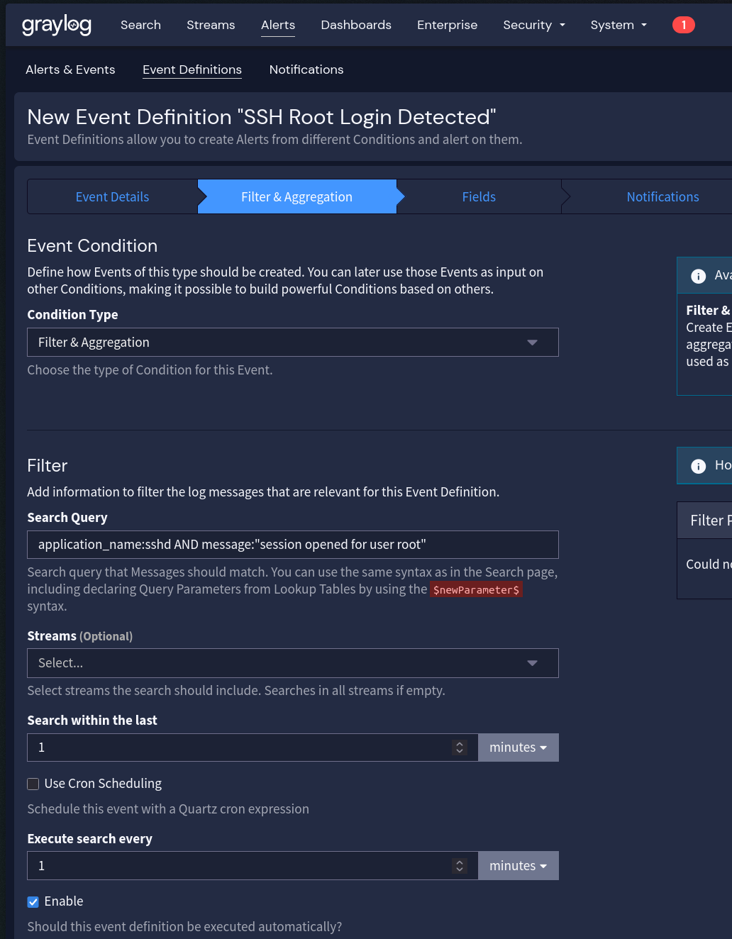 application_name:sshd AND message:"session opened for user root"dispara cada vez que root logar via SSH. -