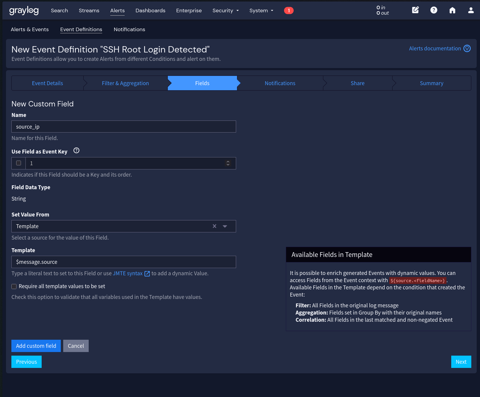 Graylog Alert: ${event_definition_title} - Email Body: Vamos usar um template customizado (veja abaixo)