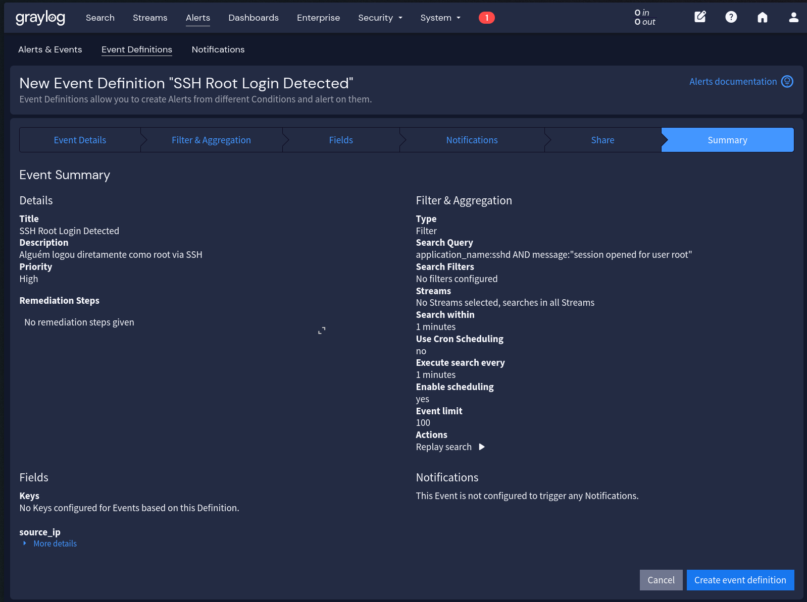 Event Definition é a regra que define “o que” dispara o alerta. Aqui a gente configura a query de busca, as condições de disparo (uma mensagem específica apareceu? aconteceram mais de X eventos em Y minutos?), e quais campos extrair para incluir na notificação.