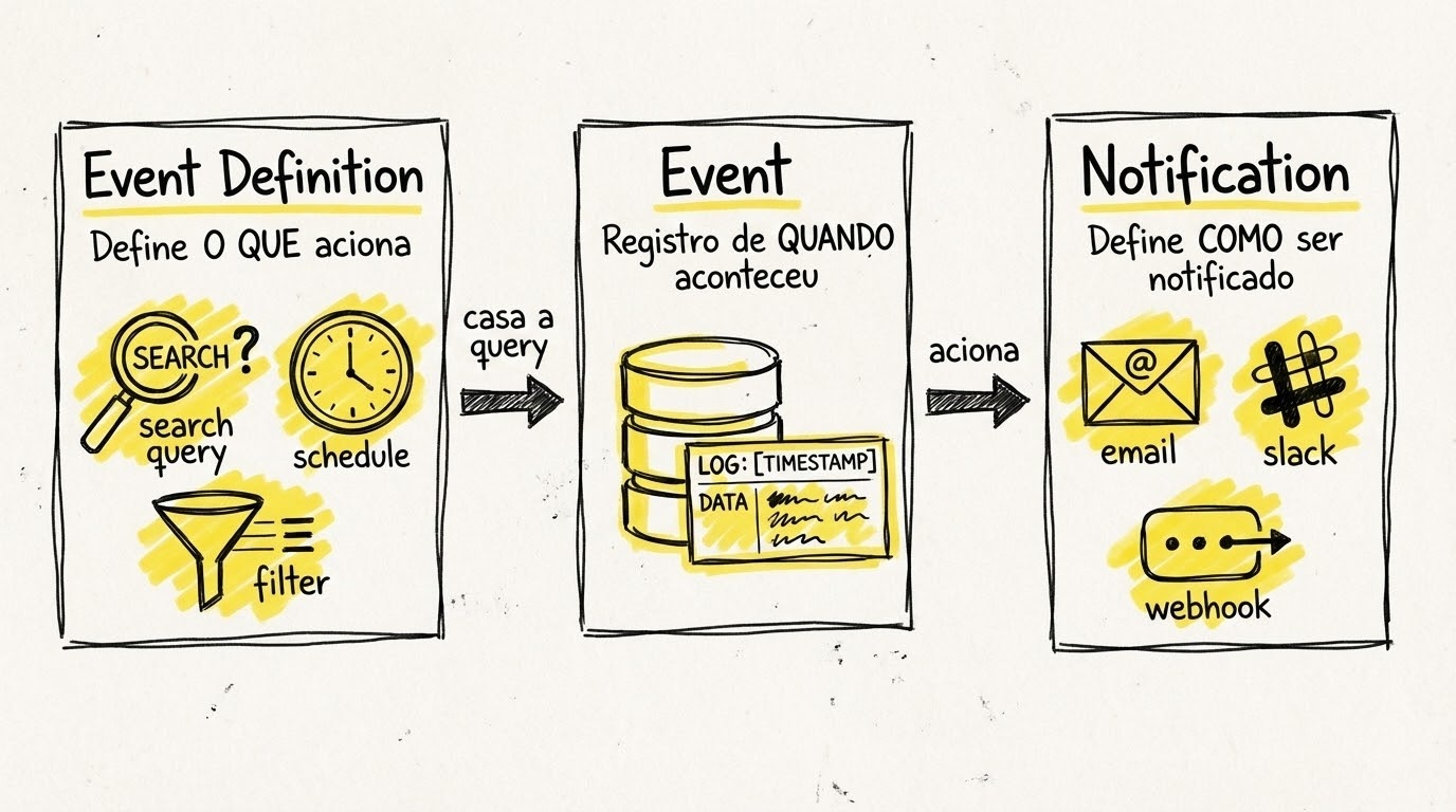 O sistema de alertas do Graylog 7.x é composto por três peças principais que trabalham juntas: