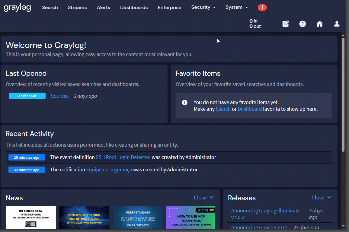 Este tutorial foca na engine de eventos do Graylog 7.x. Se você usa a versão 5 ou anterior, a interface de alertas é completamente diferente (era chamada de “Alerts & Callbacks”). Os conceitos são parecidos, mas as telas e opções mudaram bastante.